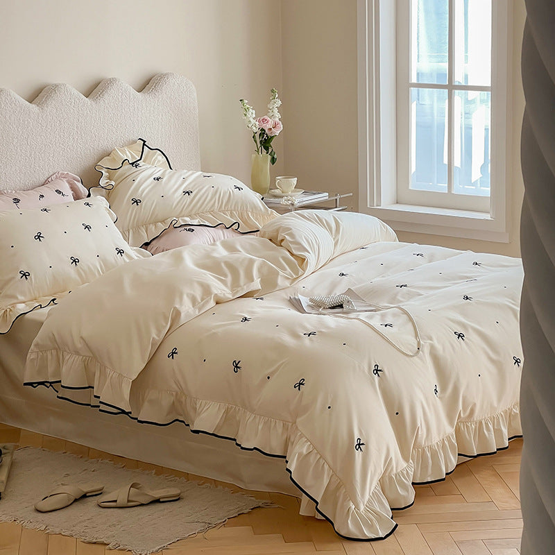 This Mini Ribbon and Lace ensemble embodies a refined sense of elegance, effortlessly elevating any room. Available in both Queen and King sizes, it's crafted from 100% cotton, ensuring a blend of comfort and style. The subtle ribbon and lace accents add a touch of sophistication to this tasteful and elegant choice. Embrace the enduring allure of luxury with the Mini Ribbon and Lace Ensemble.