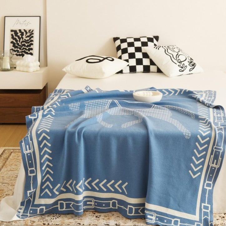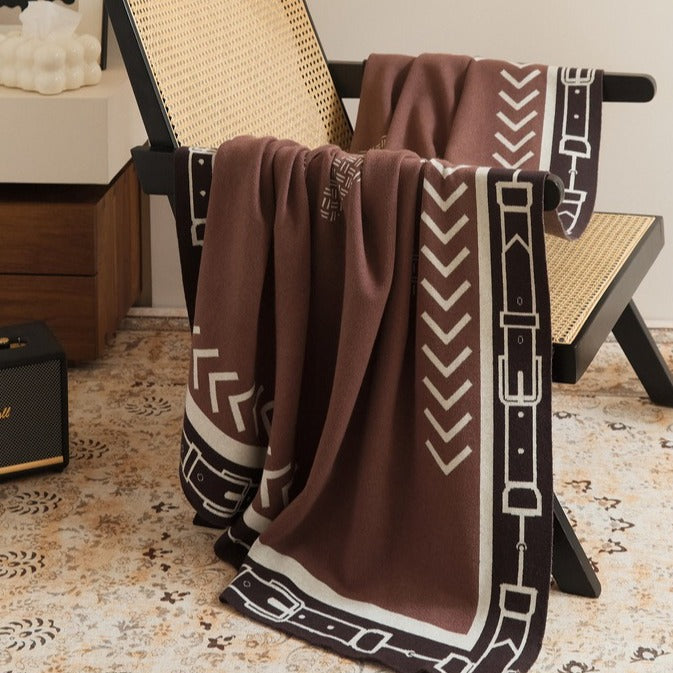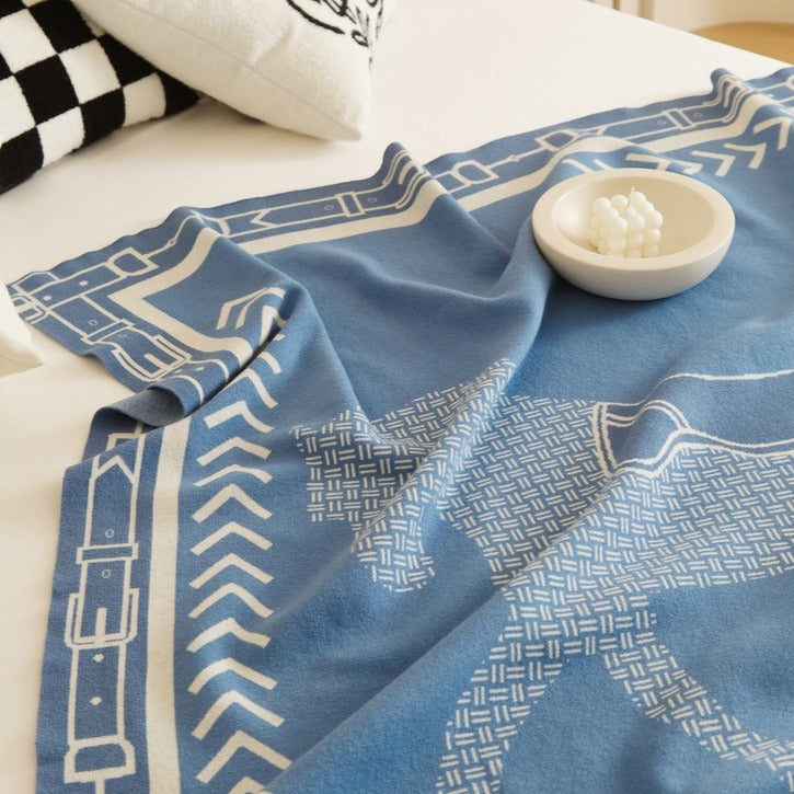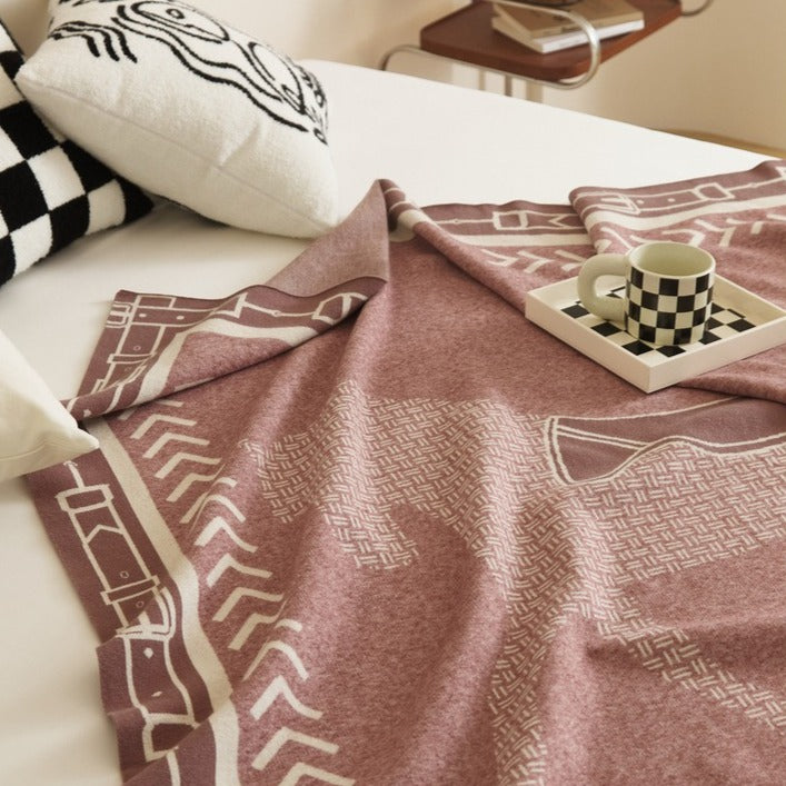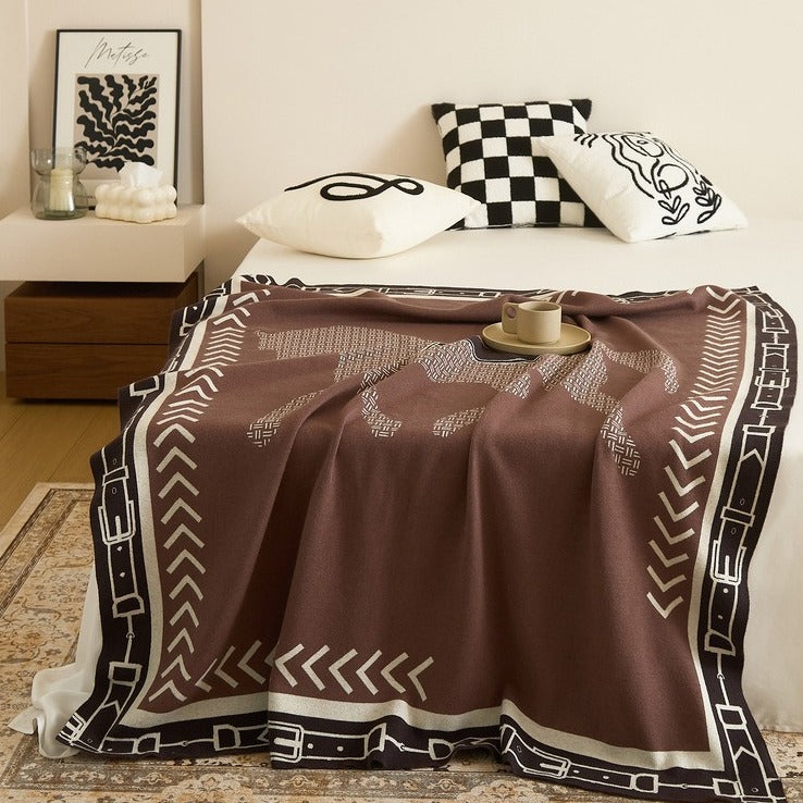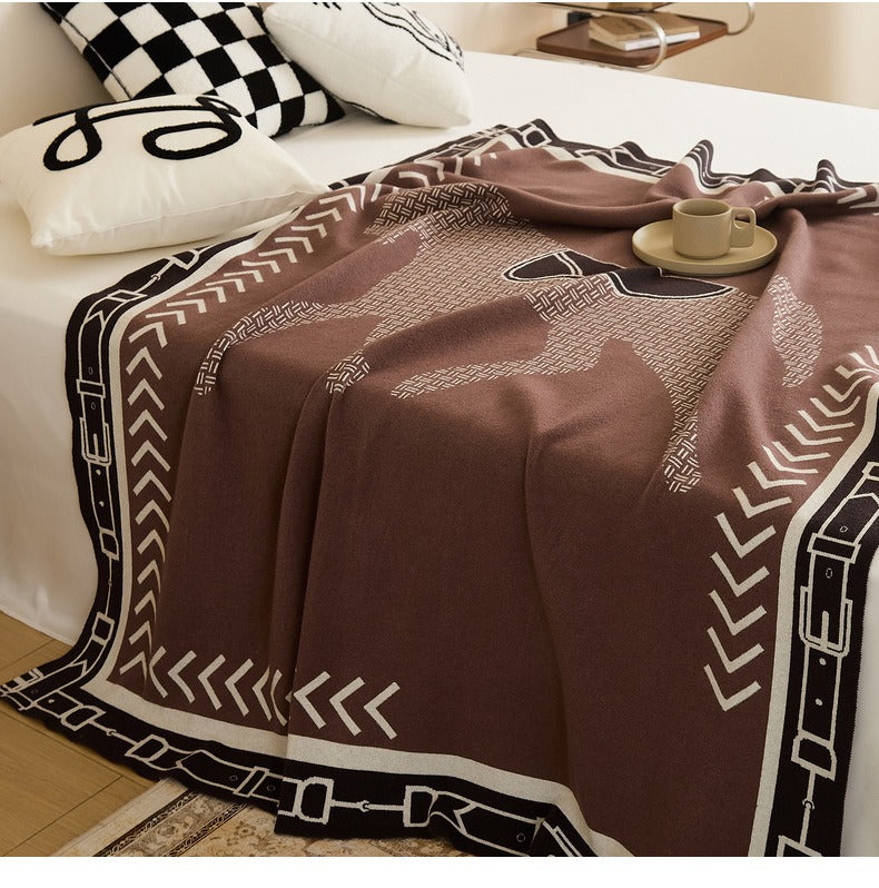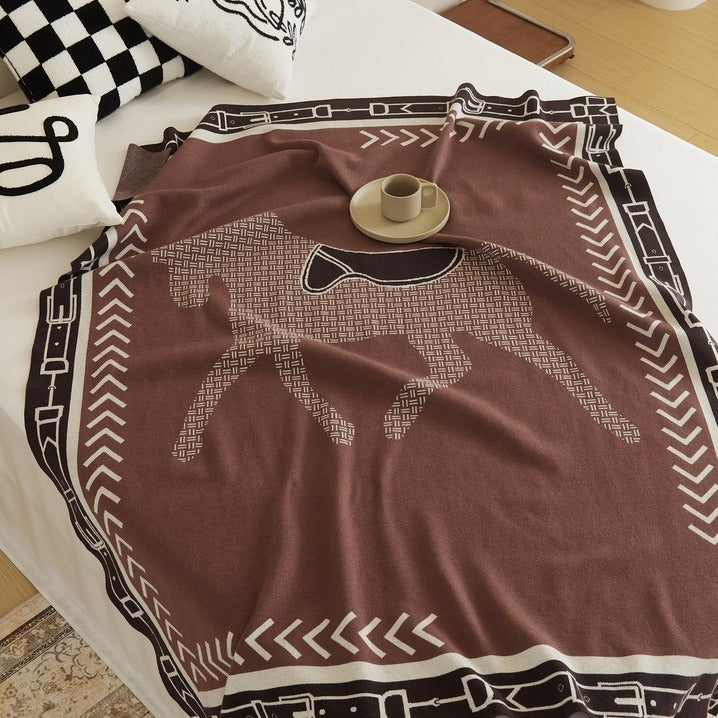 Inspired by the loyal steeds of medieval knights, this throw weaves the spirit of chivalry into every stitch. The minimalist horse silhouette, framed by retro geometric borders, brings a sense of noble calm through its soft knit texture. Whether draped over your sofa for a touch of atmosphere or wrapped around you to ward off the chill, it acts like a faithful steed, offering constant warmth and companionship.