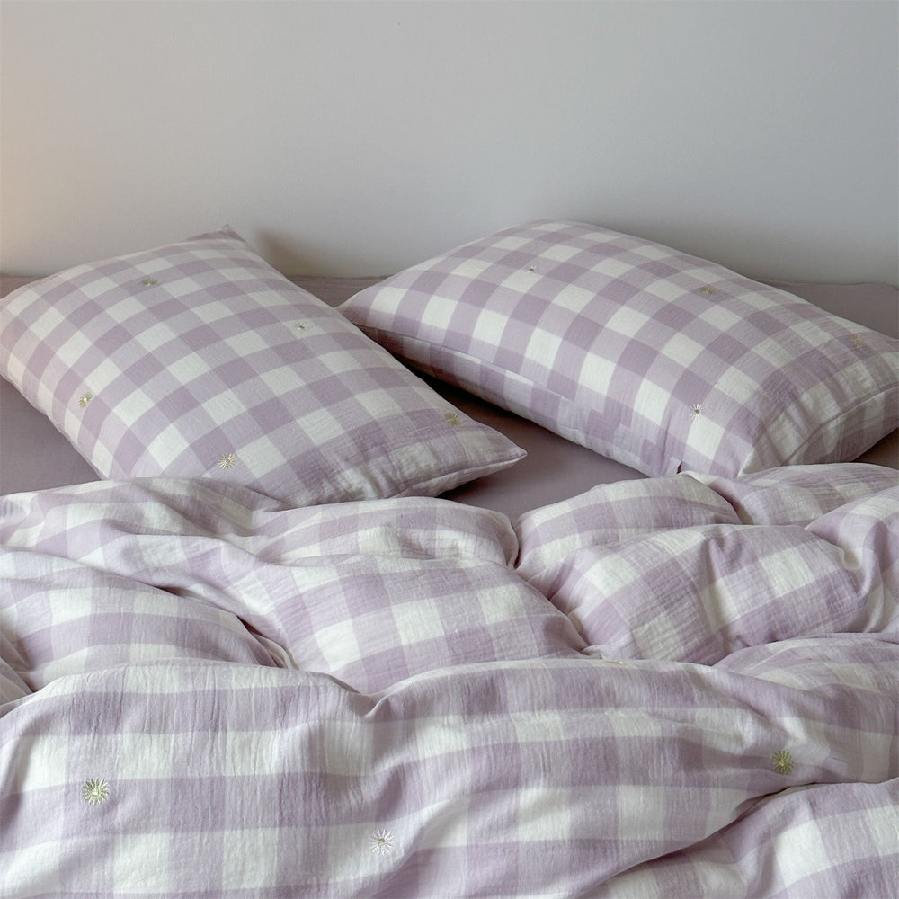 Refresh your bedroom decor with the Purple Checkered Bedding Set. This charming bedding set features delicate mini blossom motifs beautifully arranged against a stylish checkered pattern. This bedding is bound to become your go-to favorite!