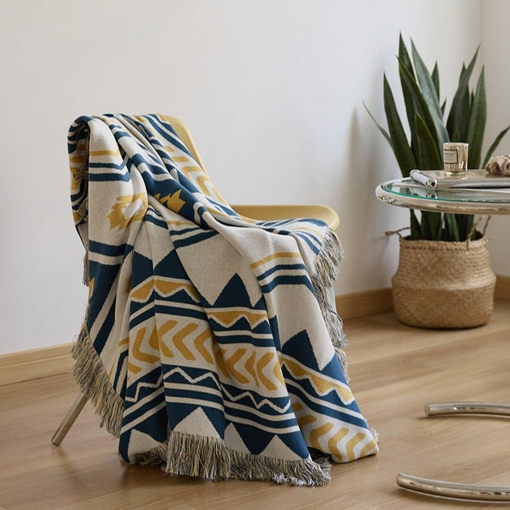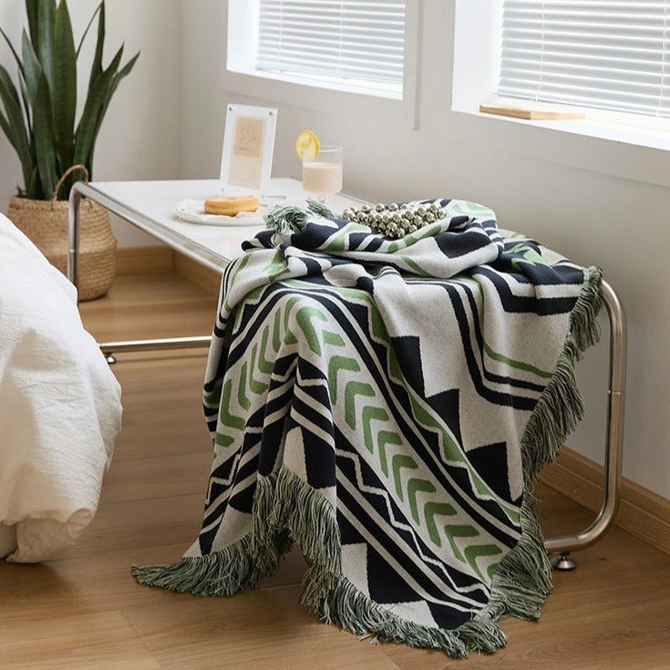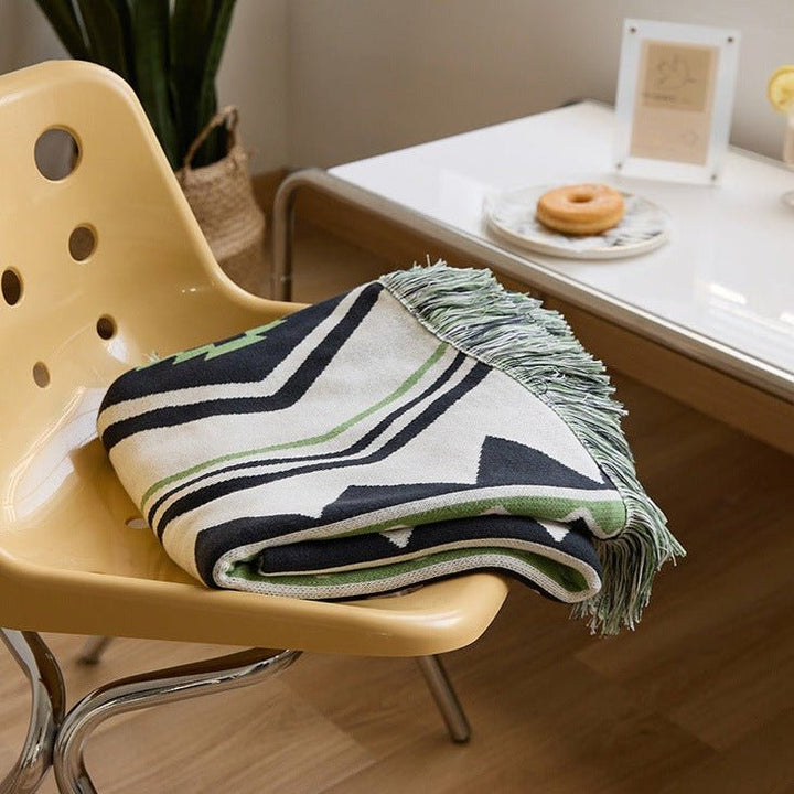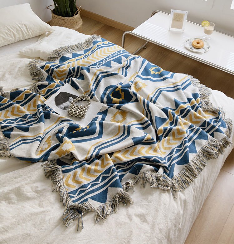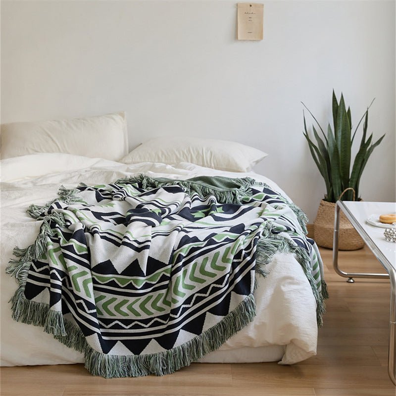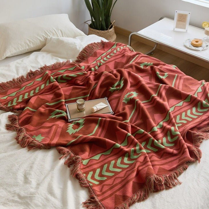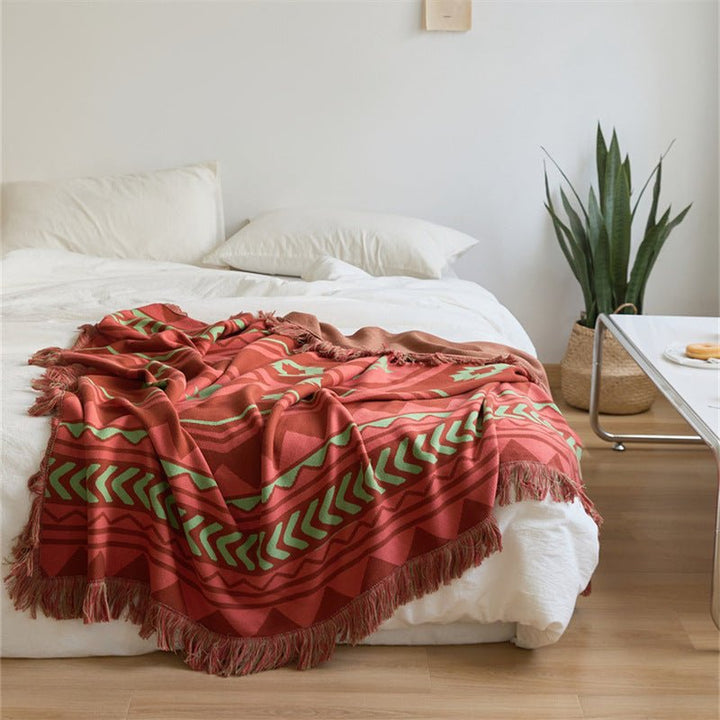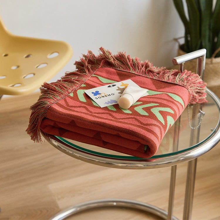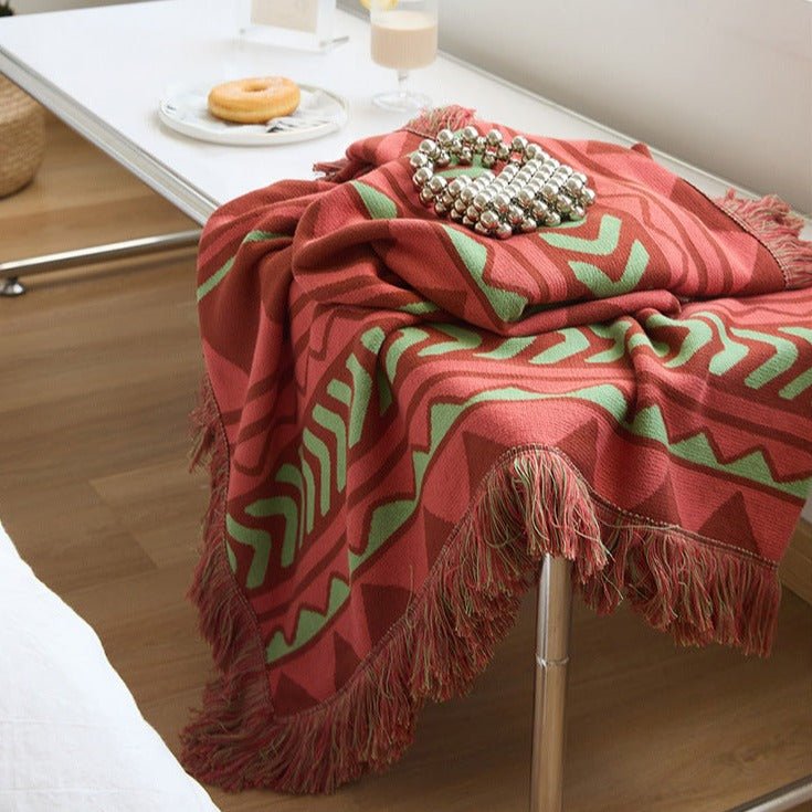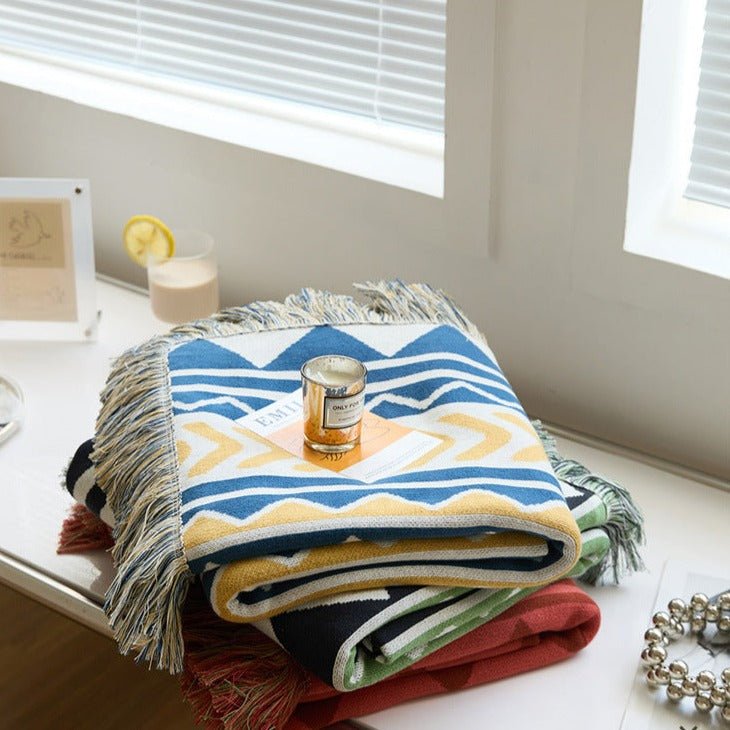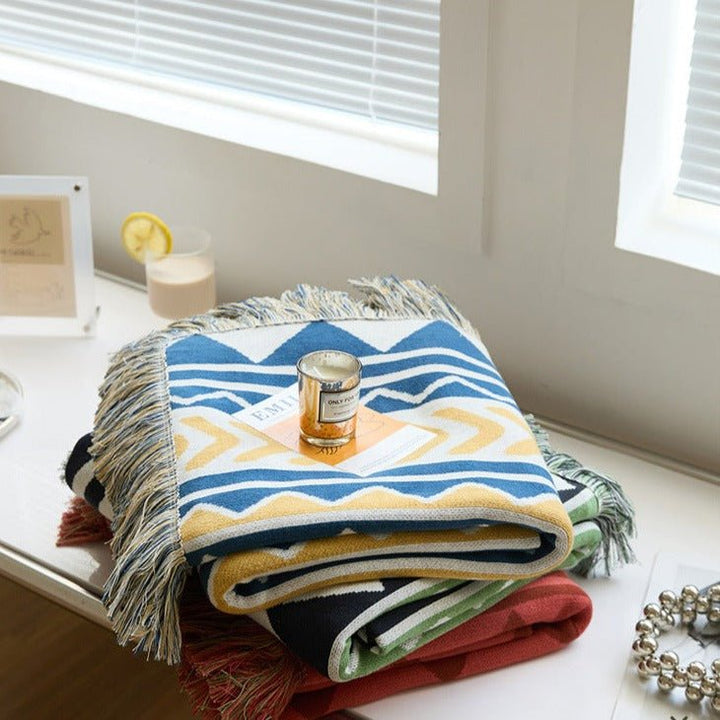 Indulge in ultimate comfort with this Diagonal Tassel Blanket! Made of 100% soft cotton, this cozy blanket boasts a striking zigzag pattern in bold hues of red, green, and blue. Stay warm and add a pop of style to your living space with this essential item.