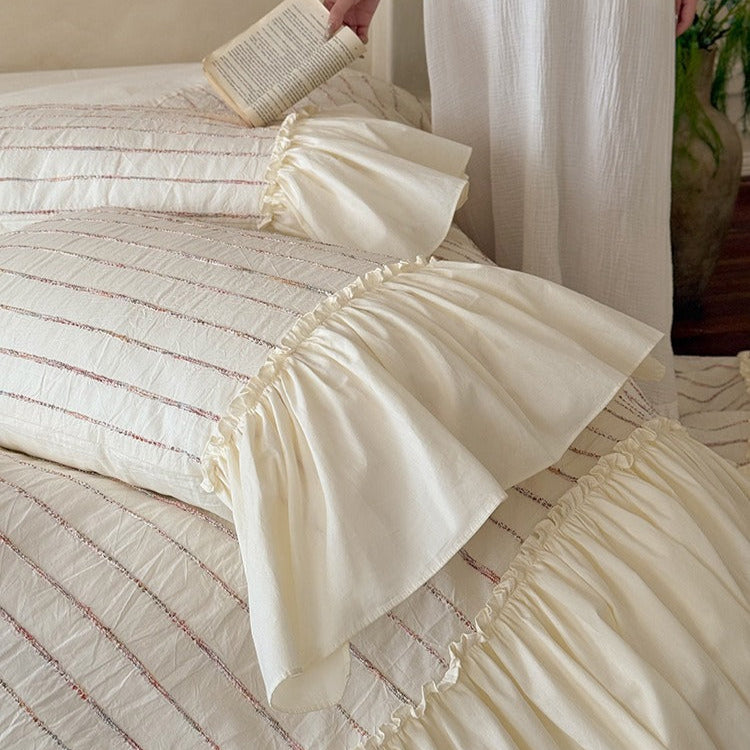 This bedding set offers gentle comfort, much like the calm of a morning breeze. Featuring soft muted stripes and charming ruffled details, it creates a soothing and inviting atmosphere in your bedroom. Designed to inspire restful nights and peaceful dreams, this set combines style with coziness, transforming your bed into a serene retreat where relaxation feels as natural and refreshing as the first light of dawn.