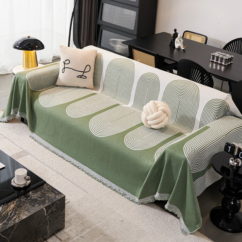 Features organic, wave-like curves in crisp white against a soothing moss green backdrop, evoking the calm of nature and resembling gentle hills or flowing vines. Fringe detailing adds a touch of bohemian softness, while the durable fabric protects your sofa. It brings a fresh, earthy vibe to your living space, perfect for infusing modern decor with natural, artistic charm.