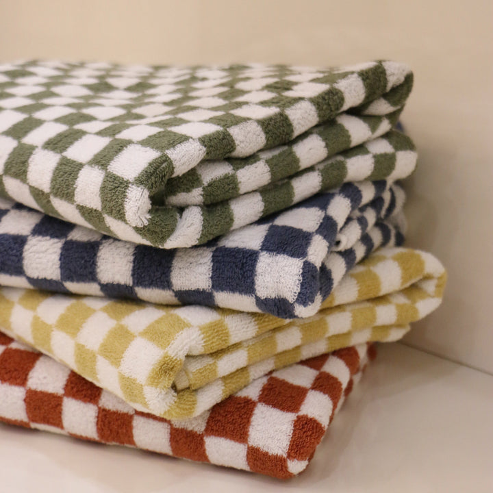 Grace with our Classic Checkerboard Towel Collection in Seagreen, Firebrick, Steel Blue and Goldenrod. (@grace_leighton)