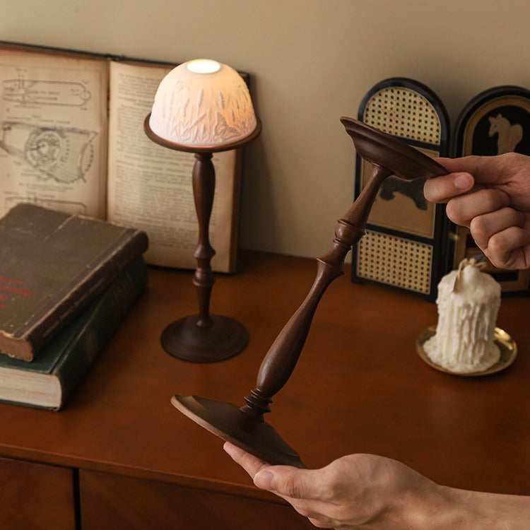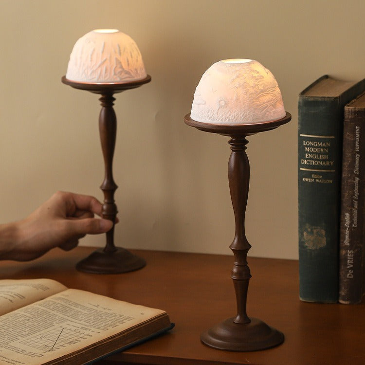 This Little Sweet Floar Holder Set combines a tall wooden base with a ceramic dome adorned with detailed carvings of floar that evoke a forest. Candlelight is diffused into a warm, captivating glow by the dome, which serves as a shade and draws attention to the intricate artistry. Perfect as a peaceful focal point or for establishing a cosy, enchanted atmosphere in living rooms and bedrooms. a fusion of ambient charm and craftsmanship.