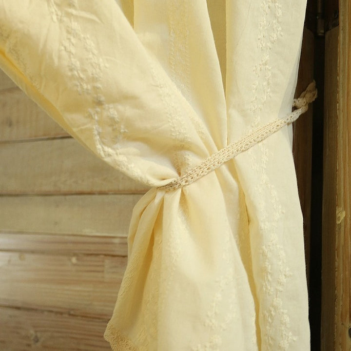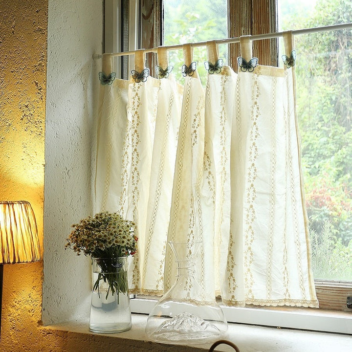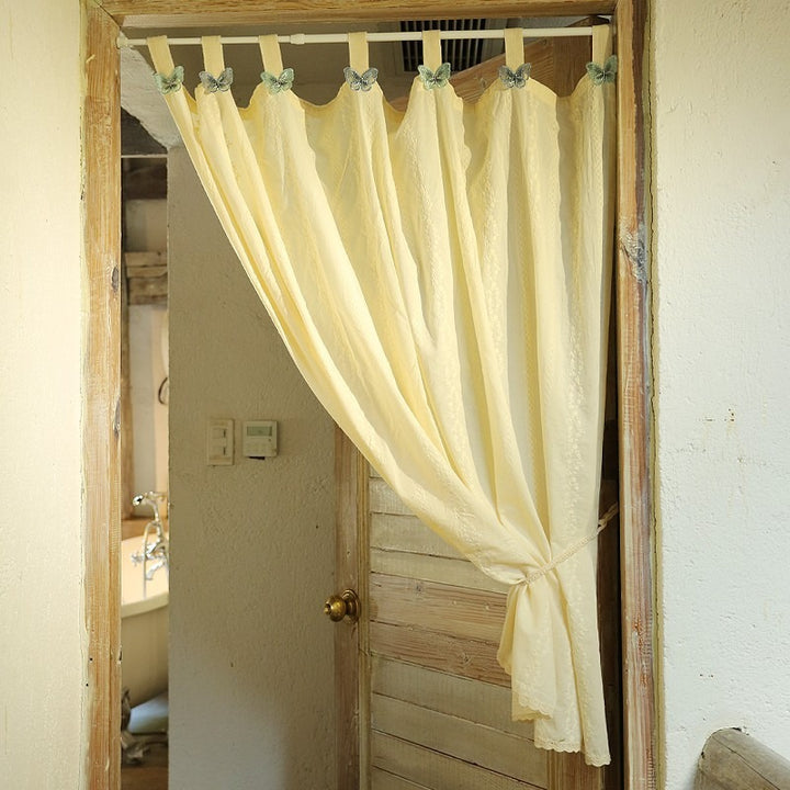 Crafted from soft, creamy fabric, this curtain is decorated with delicate butterfly embroidery for a touch of natural beauty. It uses matching ties for hanging, giving a casual yet refined look. The lace hem at the bottom adds a layer of intricate elegance to your windows.