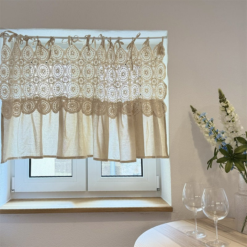 An upper lace section featuring intricate circular embroidery and a 30cm linen lower tier in warm beige. The ribbon-tied design adds a whimsical touch, while the combination of delicate lace and textured linen brings country cottage charm to cabinets or small windows, filtering light while infusing cosy sophistication.
