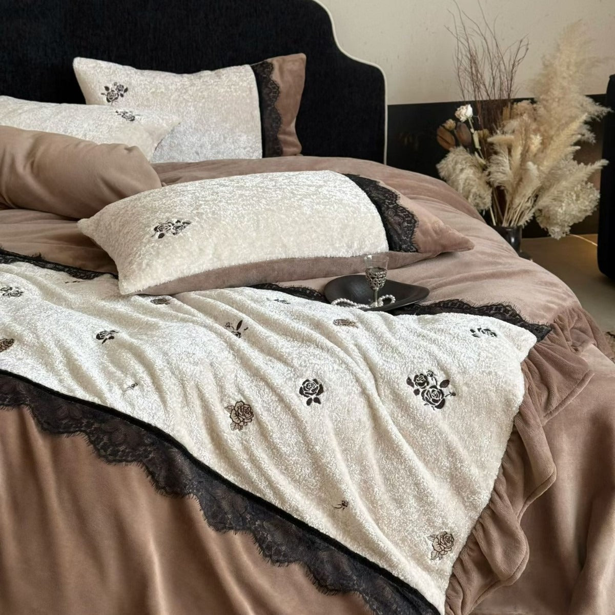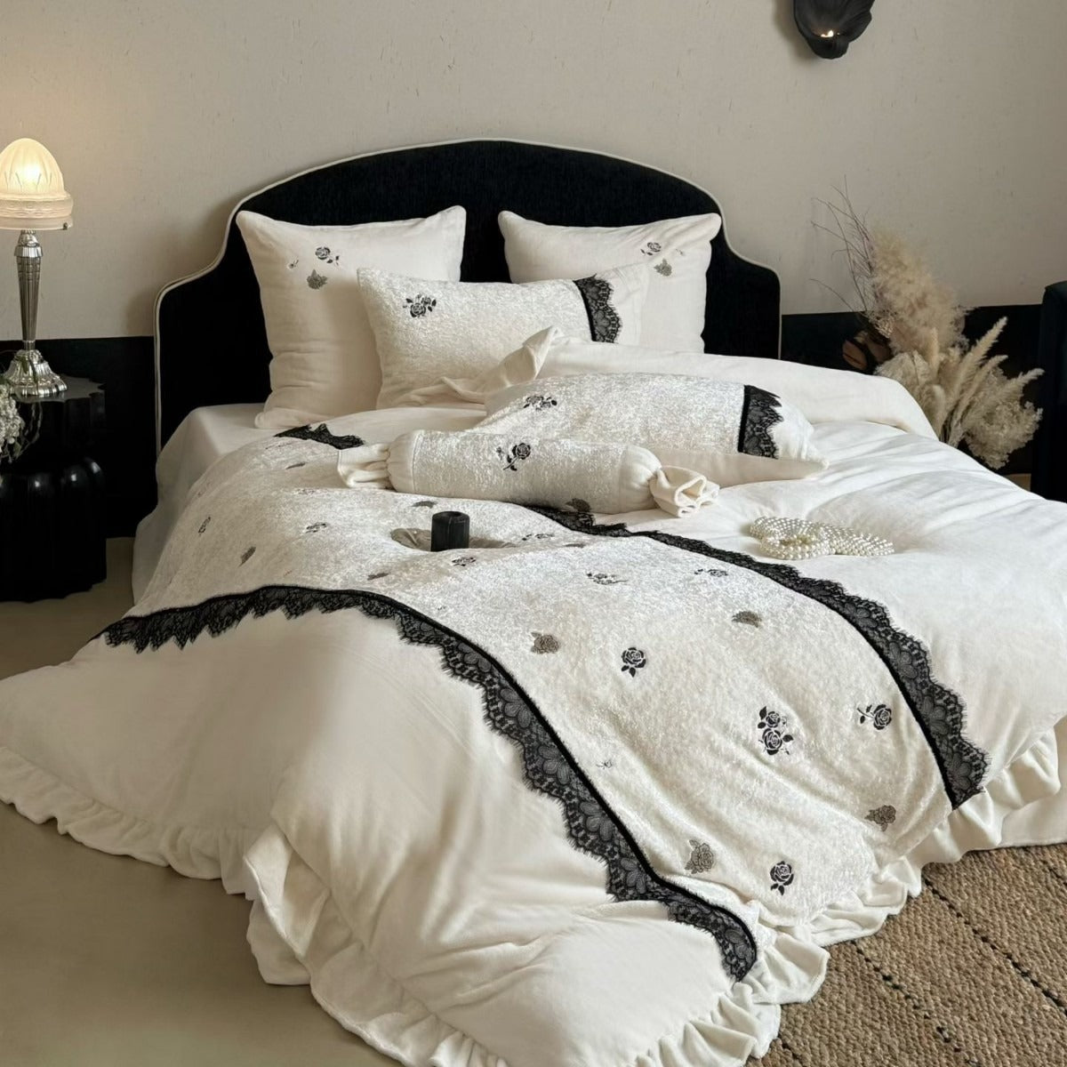 Adorned with delicate embroidered roses and trimmed with intricate black lace, it wraps your bed in dark glamour. Crafted from warm, soft fabric, this set transforms your bedroom into a cosy, opulent sanctuary-ideal for restful nights and lazy mornings.