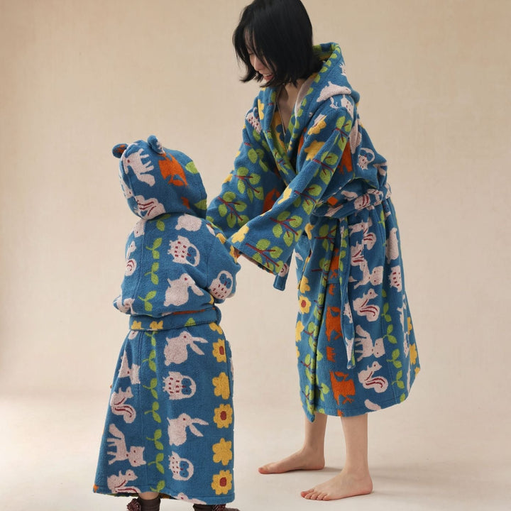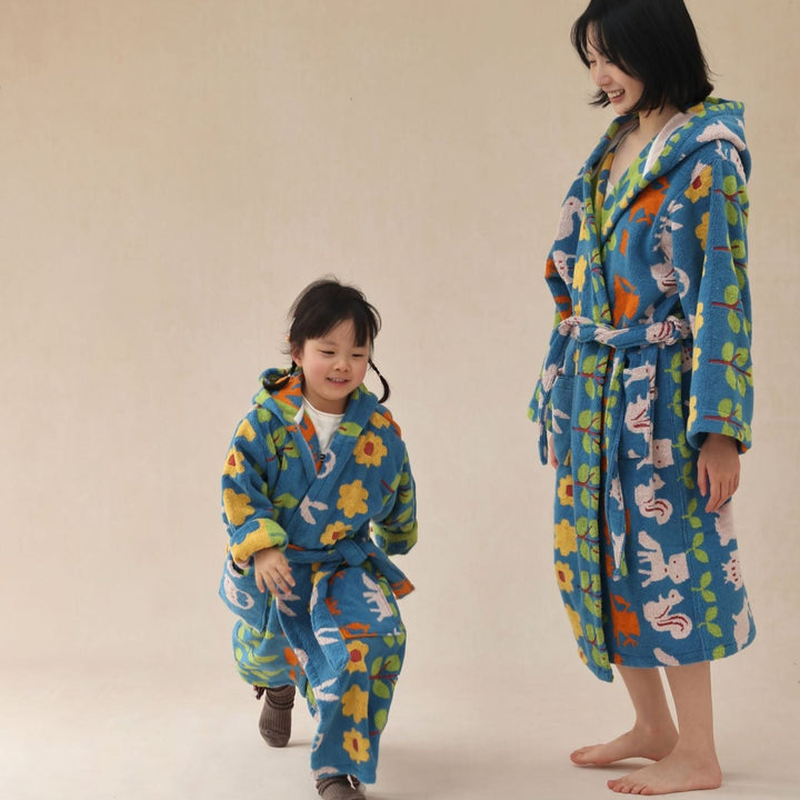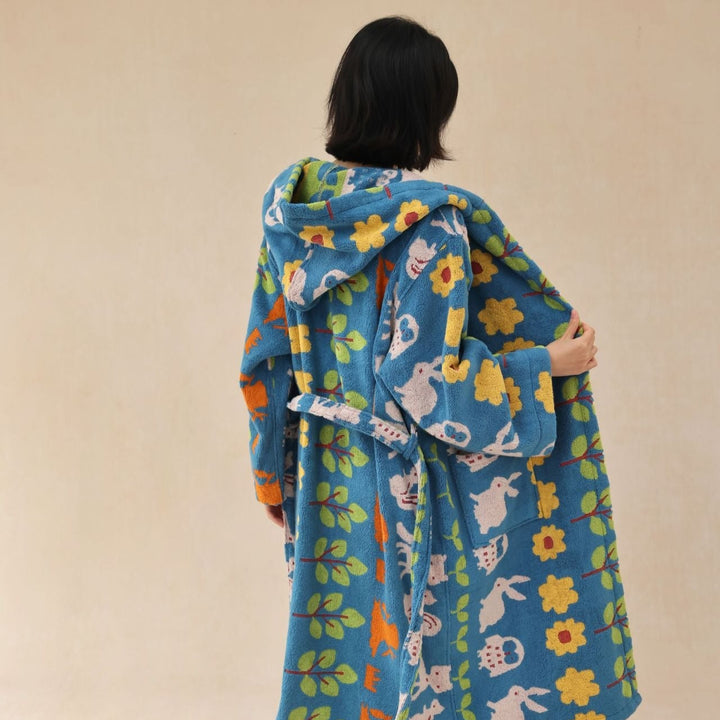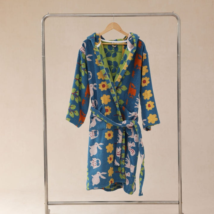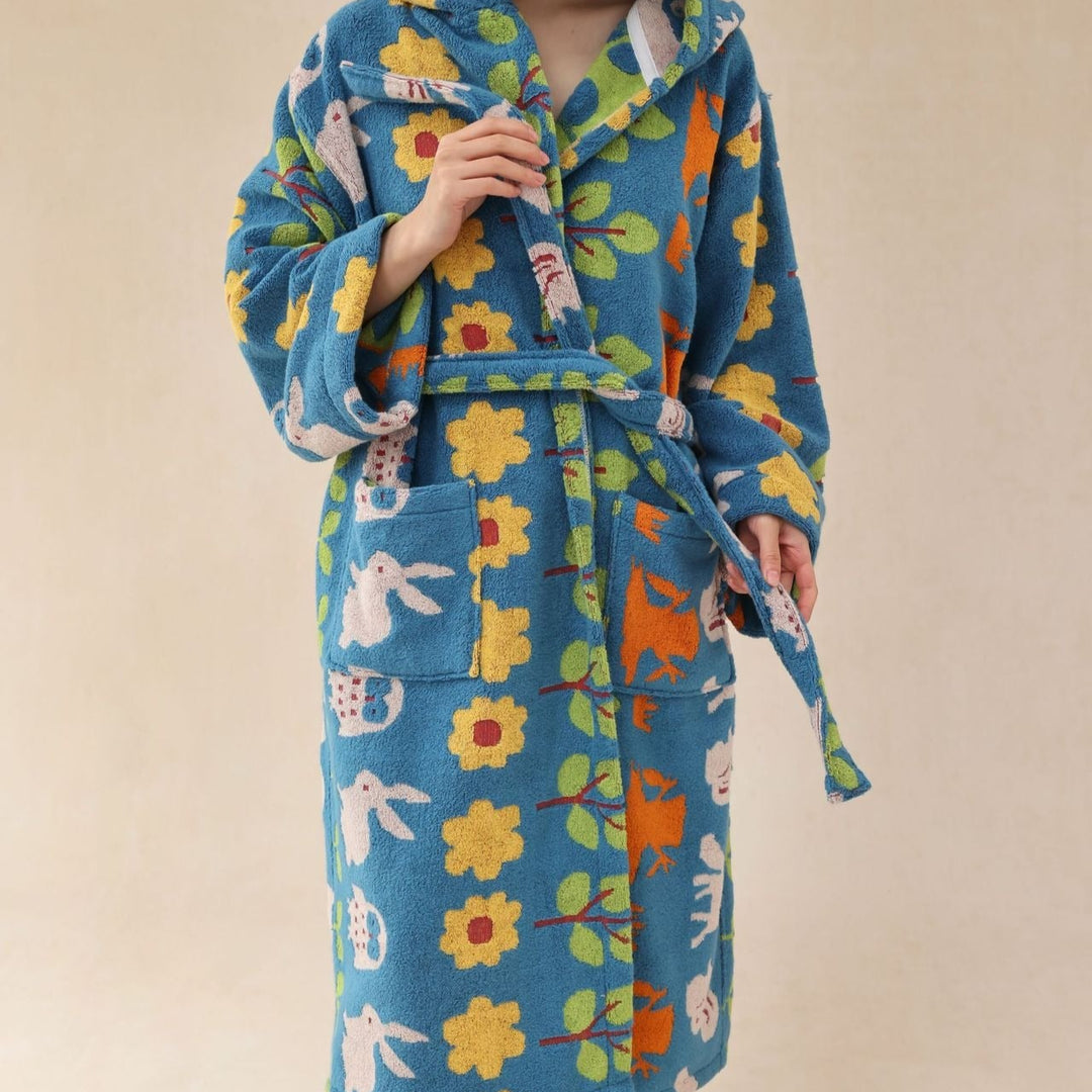 Relax in comfort and charm with our Fairytale Forest Bathrobe Unisex Collection, crafted from soft, long-staple cotton. Featuring whimsical patterns of bunnies, owls, flowers, and trees, this bathrobe is available in a variety of colourful hues, adding a warm and lively vibe to your daily routine.