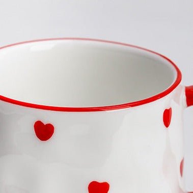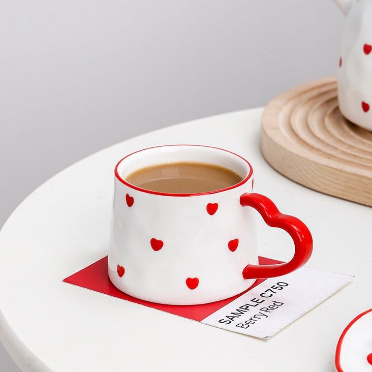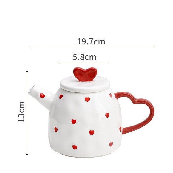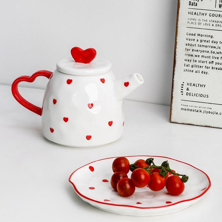Bring a little extra love and sweetness to teatime with this adorable Heart Teacup, Pot and Plate collection. This ceramic set is rustically made and adorned with red hearts. The cups feature a heart-shaped handle and the teapot is topped with a red heart handle. This collection is perfect to share the tea which someone you loved. Build your heart collection with the option to choose from the cups, pot and cake plates.