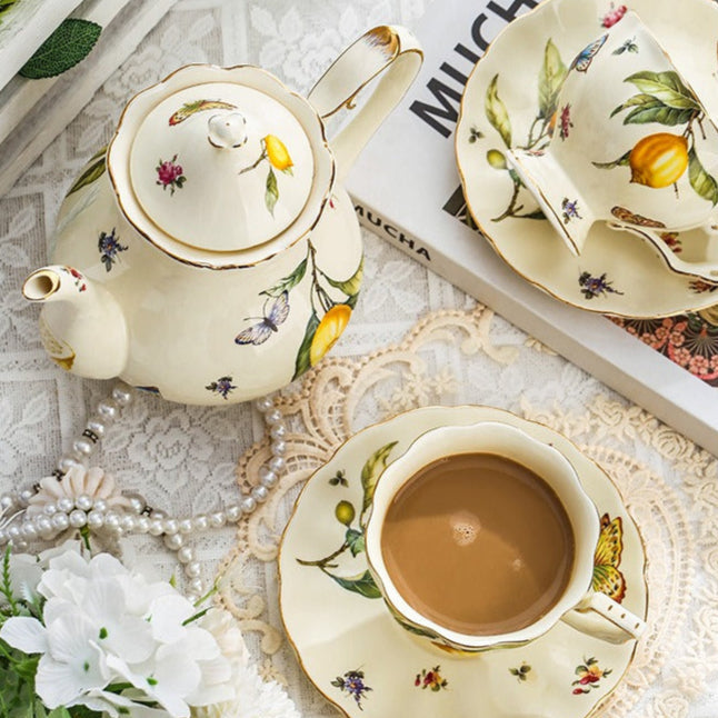 Enjoy a serene moment by the window with our delightful Lemon Garden Tea Set. Perfect for pairing with a slice of cake, this charming set features two cups, two saucers, and a teapot, all beautifully decorated with vintage yellow lemons and delicate butterflies. It's an elegant addition to your tea-time collection!