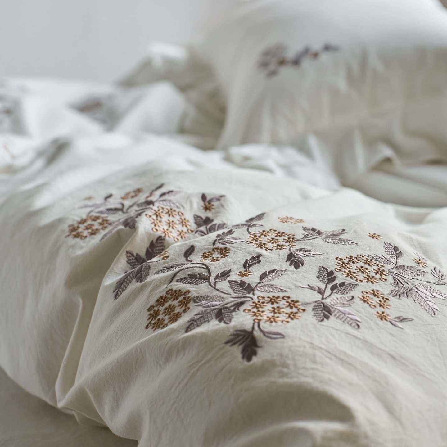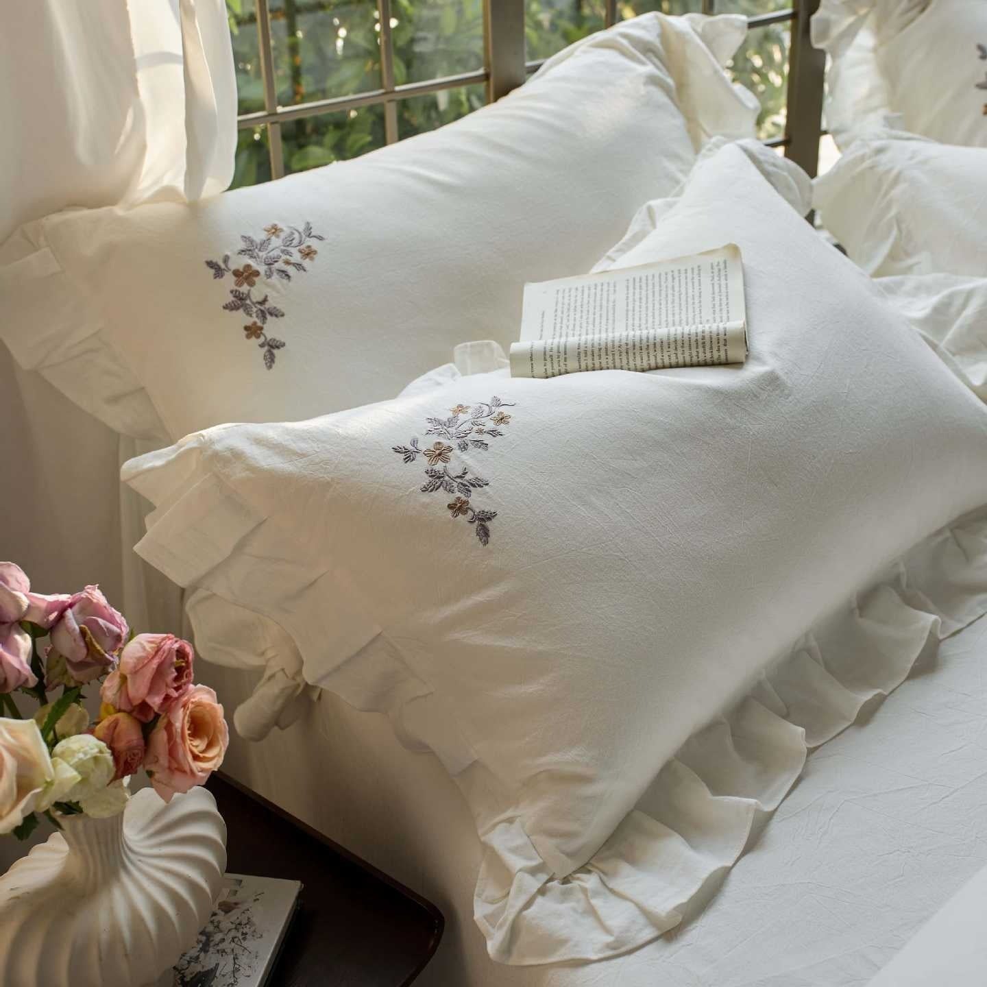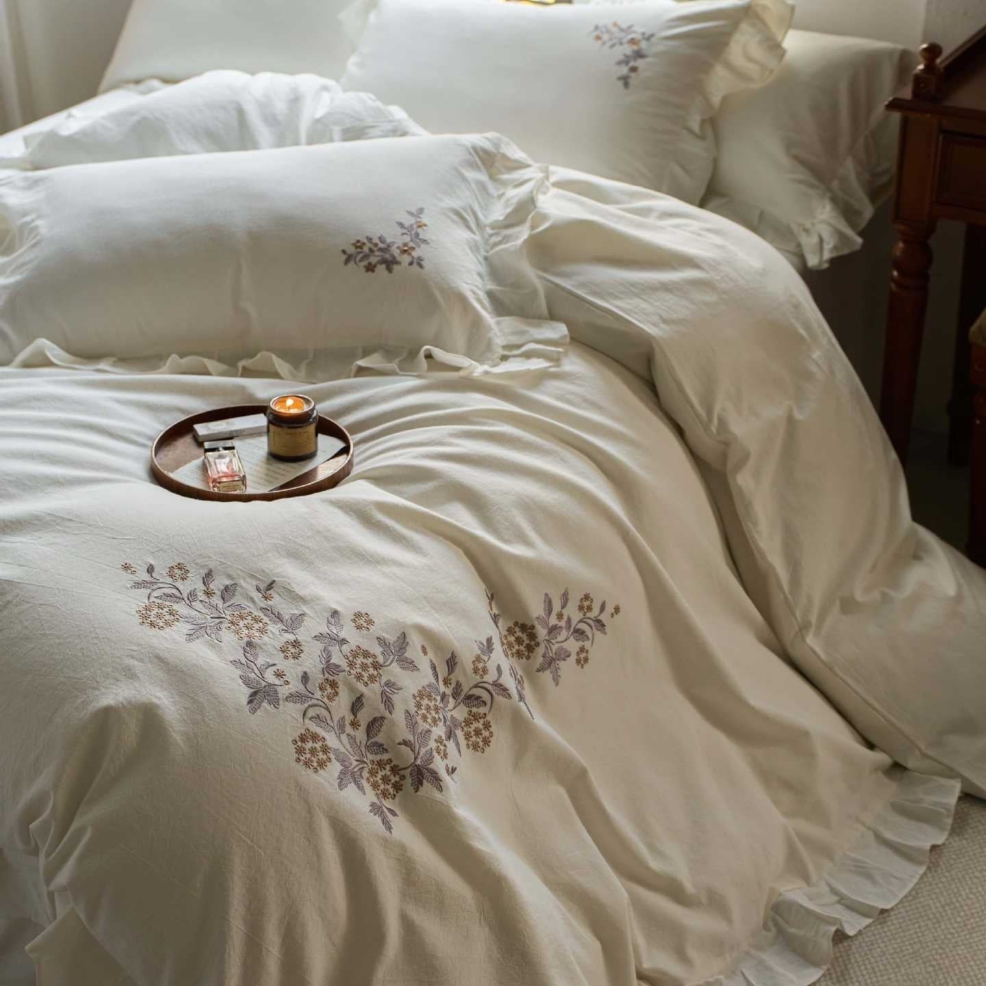 This set comes with pretty ruffles that add a sweet, feminine touch to every corner. Delicate embroidered flowers are scattered across the fabric, giving your bed a charming, handcrafted look. Made from a soft cotton-linen blend, it feels amazing against your skin and keeps you comfortable all night long. The natural fabric breathes beautifully, so you'll stay cozy without overheating. Whether you're a princess at heart or just love pretty things, this bedding set brings a playful, dreamy vibe to your bedroom. Sweet dreams guaranteed!