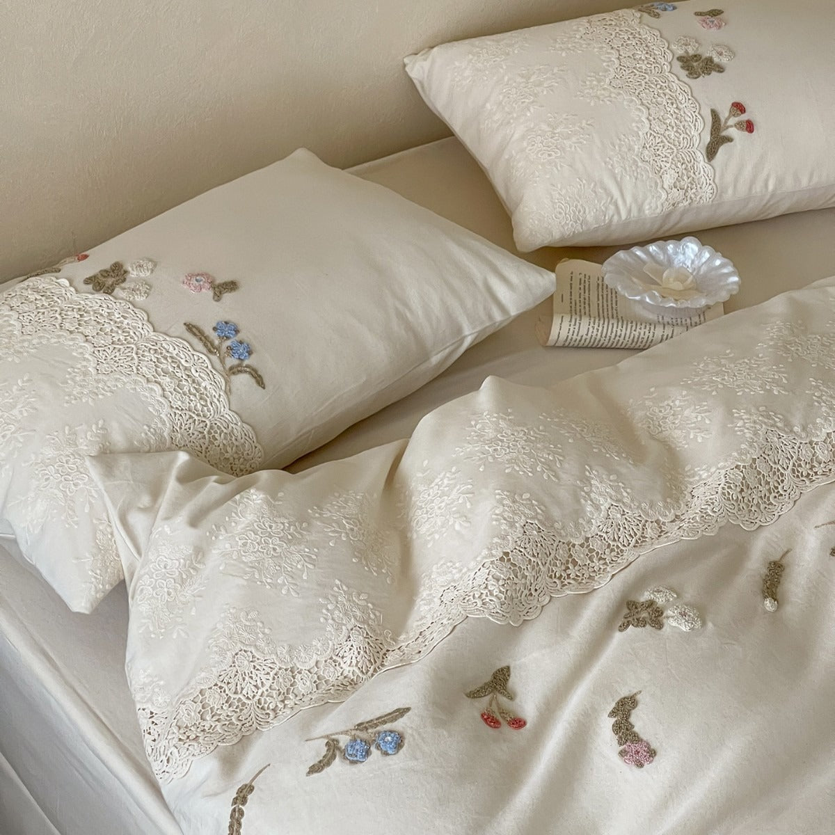 Our stunning collection features intricately embroidered floral motifs that dance across soft cotton-linen fabric, creating a luxurious botanical escape. Delicate lace trim adorns the edges, adding an elegant touch of romance to every piece. The breathable cotton-linen blend keeps you cool and comfortable through the night while maintaining its shape wash after wash.