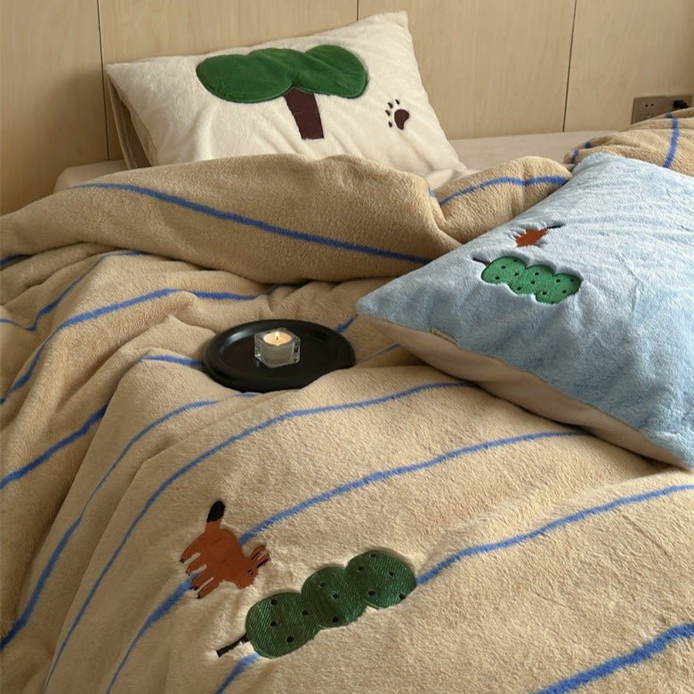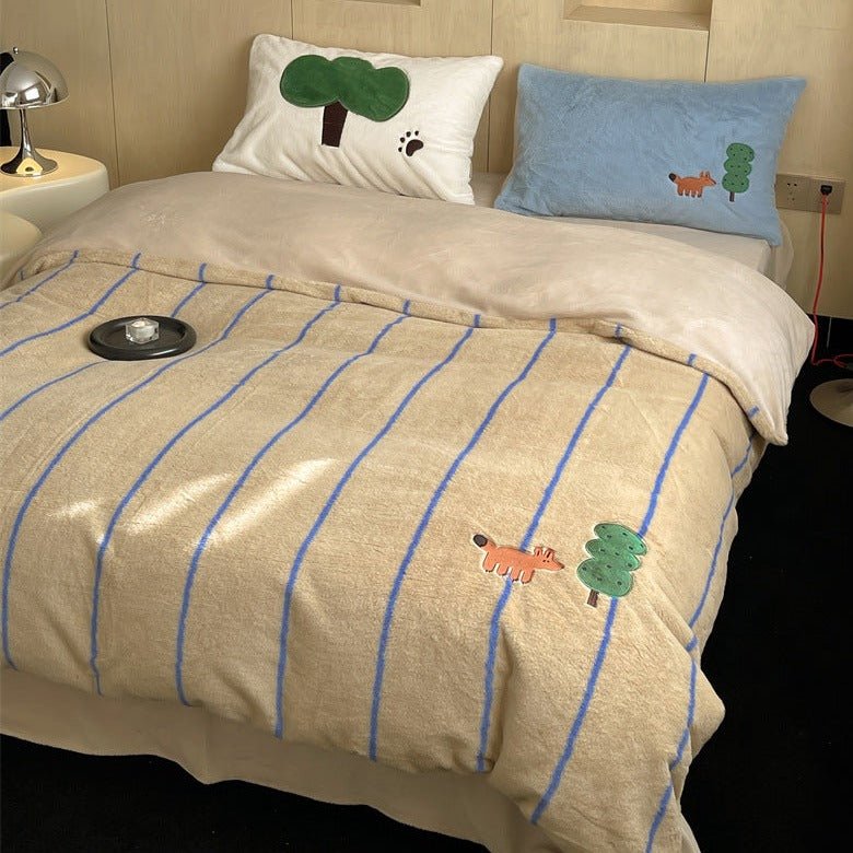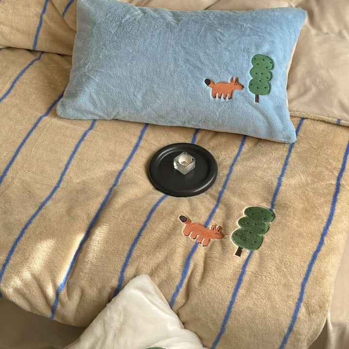 The Woodland Fox Bedding Set infuses your space with whimsical woodland charm. Adorned with cute fox and tree motifs on a khaki base with blue stripes, it’s made from plush, soft fabric. Ideal for crafting a cosy, natural, inspiring nook for peaceful rest.