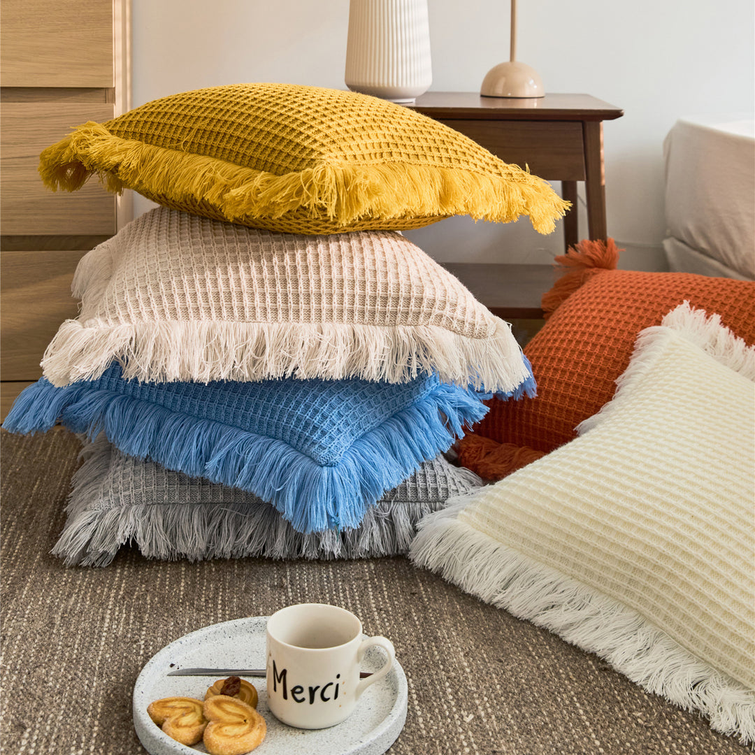 Needing more waffle in your life? Easily style your room with our Waffle Cushion Cover. Featuring a fringed pattern on its sides, these cushion covers instantly brighten any room. Available in Beige, White, Orange, Light Grey, Goldenrod and Blue.