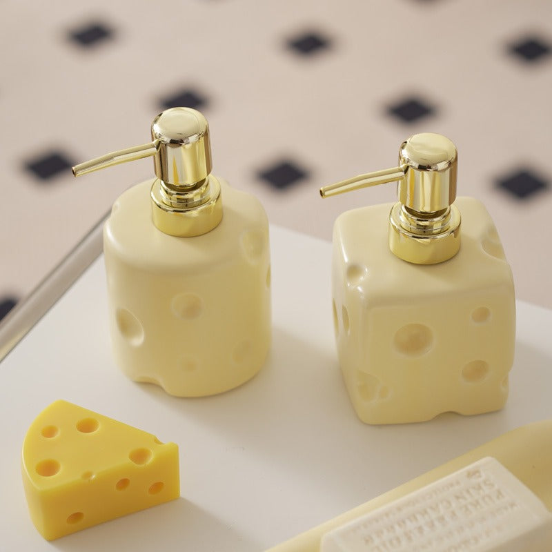 In your bathroom, these cheese - patterned ceramic dispensers are both stylish and practical. Their eye - catching design and convenient pump tops make them great for holding hand soap or hand cream. Each dispenser with a silver or gold contrast pump.