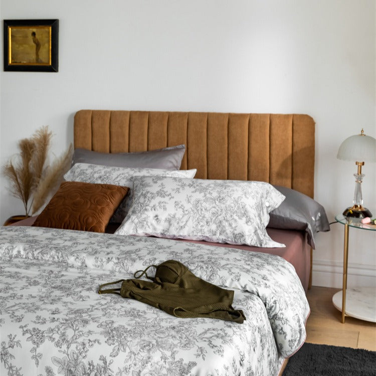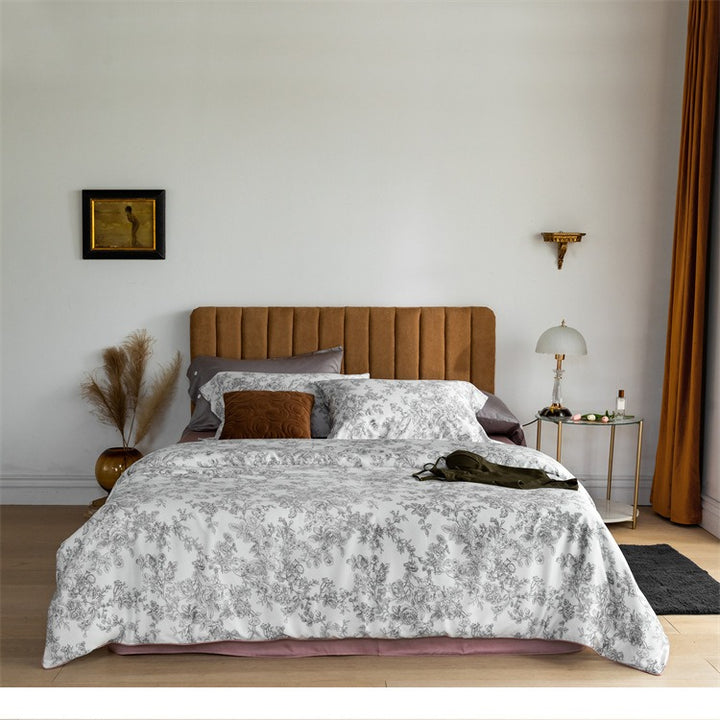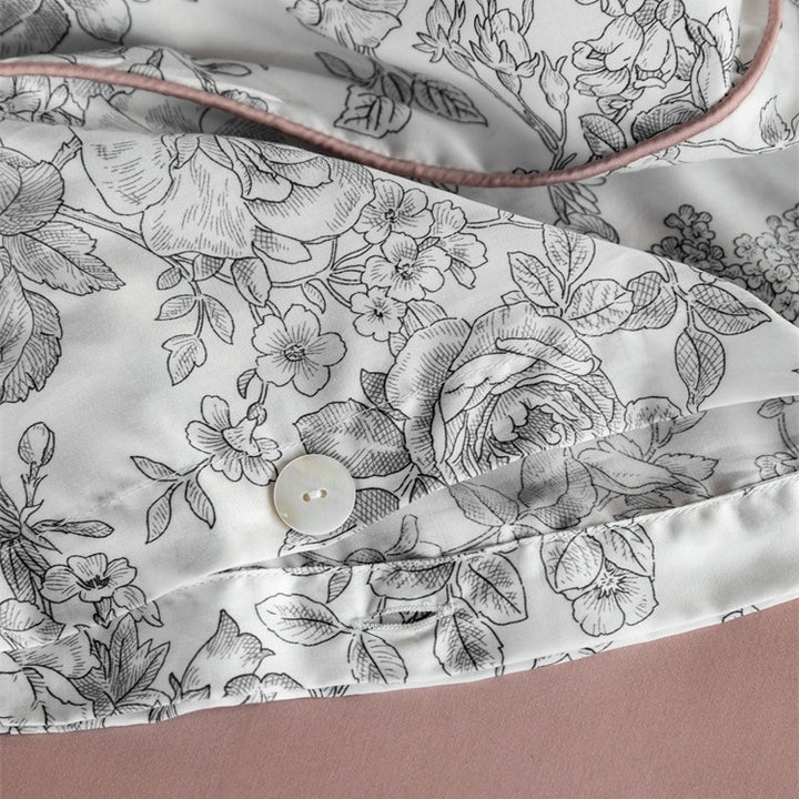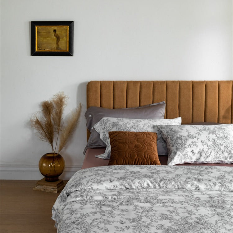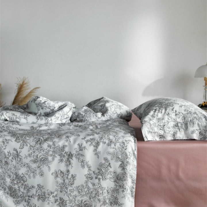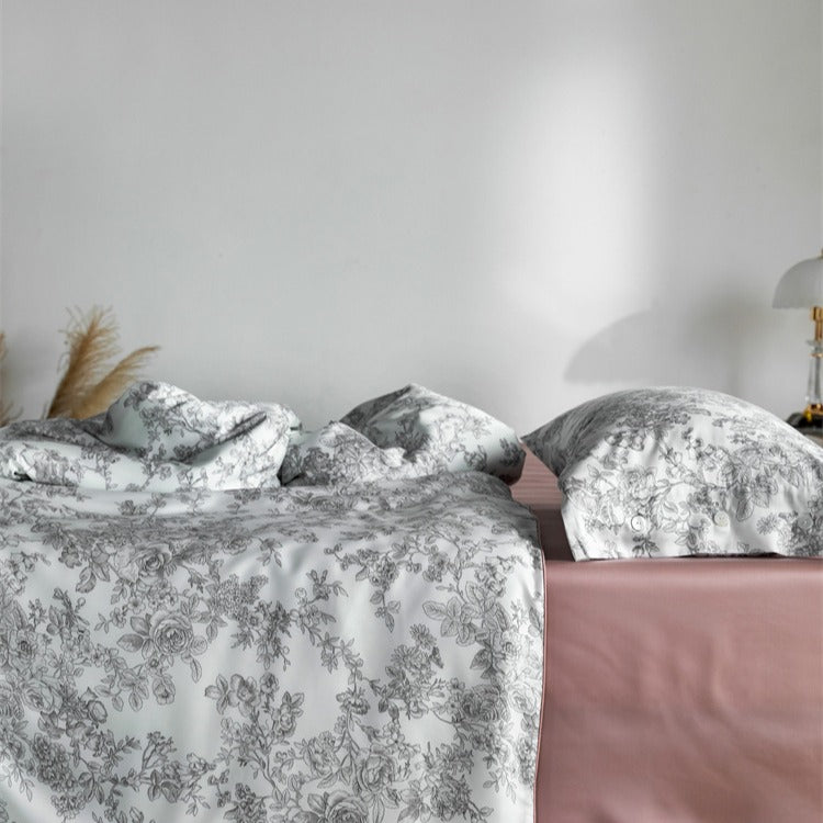 Indulge in the allure of our Gray Floral Reverie Bedding. Meticulously crafted from  Lyocell silk, its soft, breathable fabric ensures a cool and comfortable sleep all night long. The intricate gray-toned floral patterns are like a delicate watercolor painting, bringing a touch of timeless elegance and a hint of mysterious charm to your bedroom.