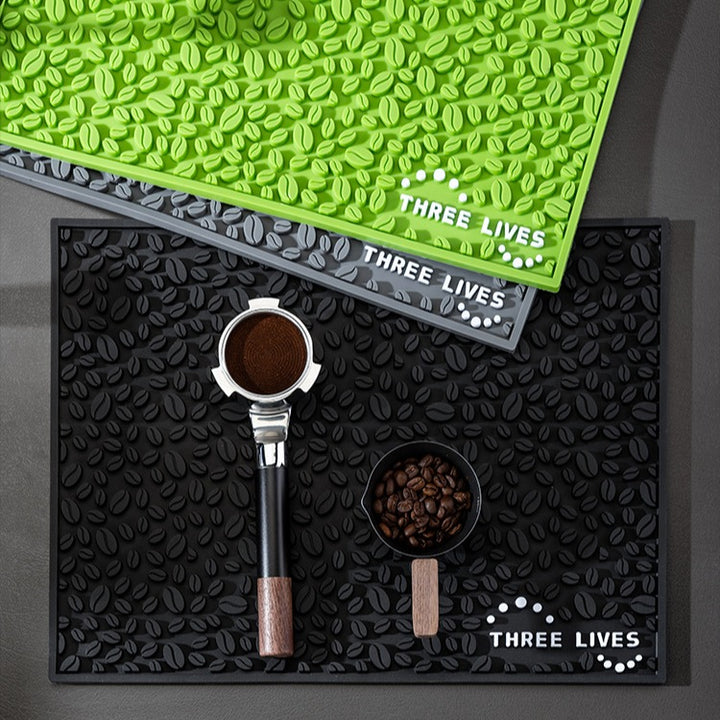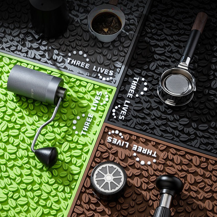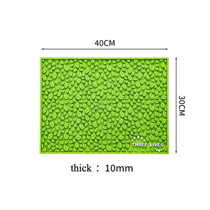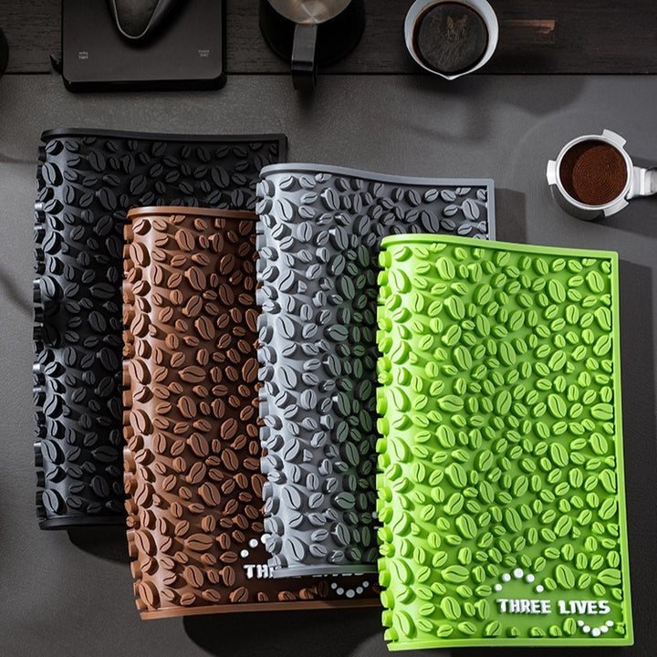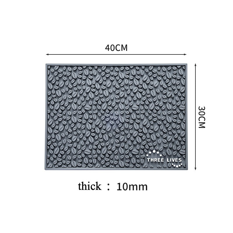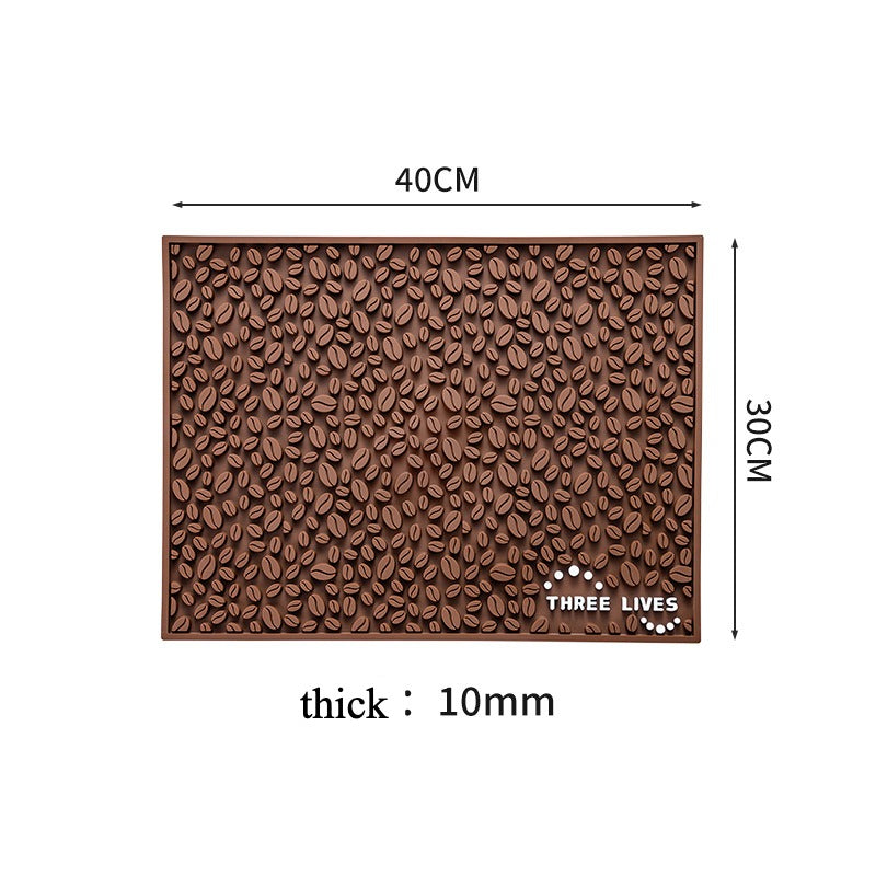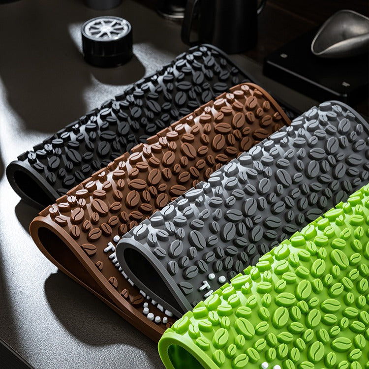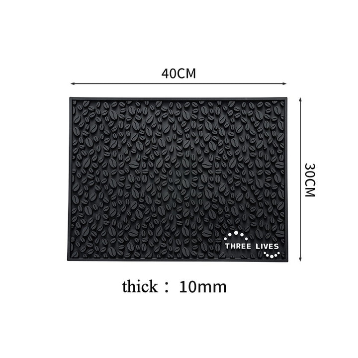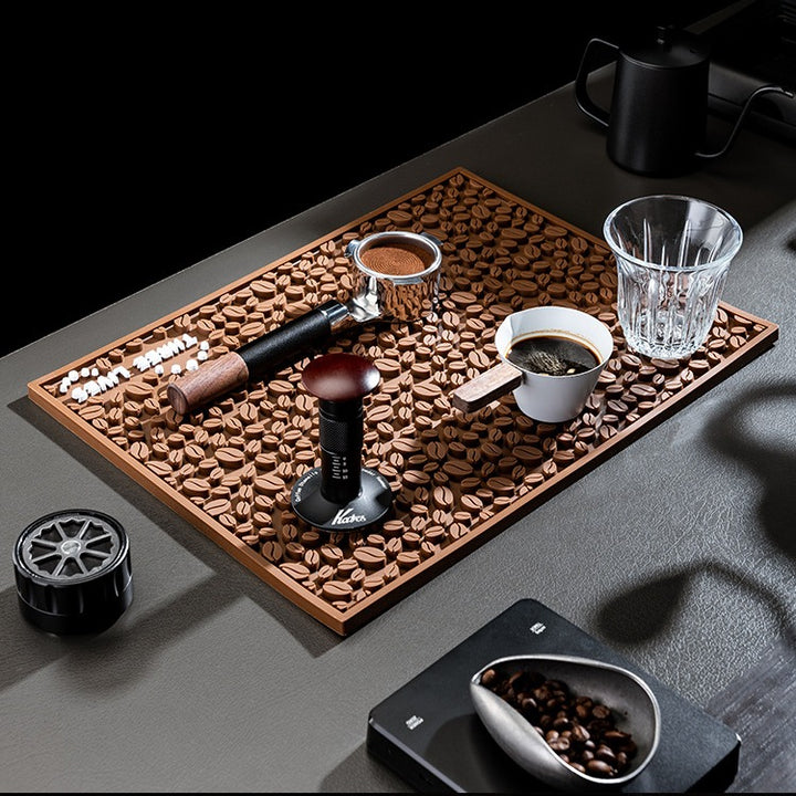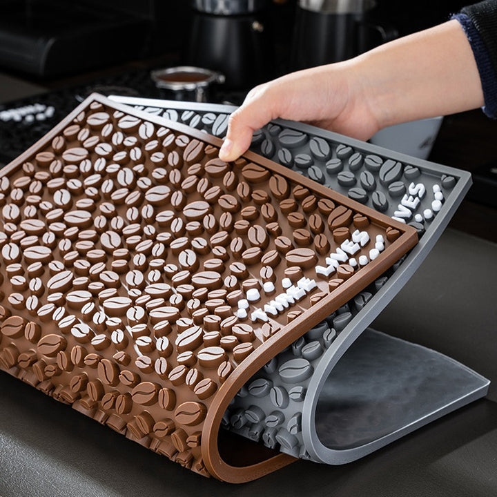 A durable bar mat with playful 3D coffee bean textures. The extra-large size catches drips from mugs and espresso tools while protecting countertops. Non-slip, heat-resistant, and easy to clean.