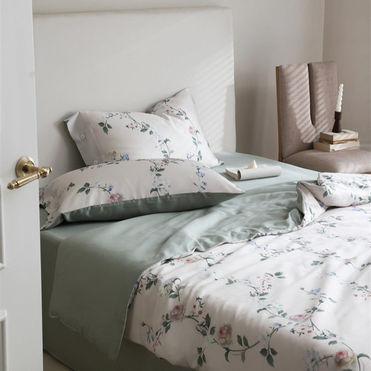 The design showcases delicate floral patterns in soft, natural hues, reminiscent of wildflowers dancing in a peaceful meadow. Paired with a soothing light - green bedsheet, the set creates a harmonious and refreshing atmosphere in your bedroom.