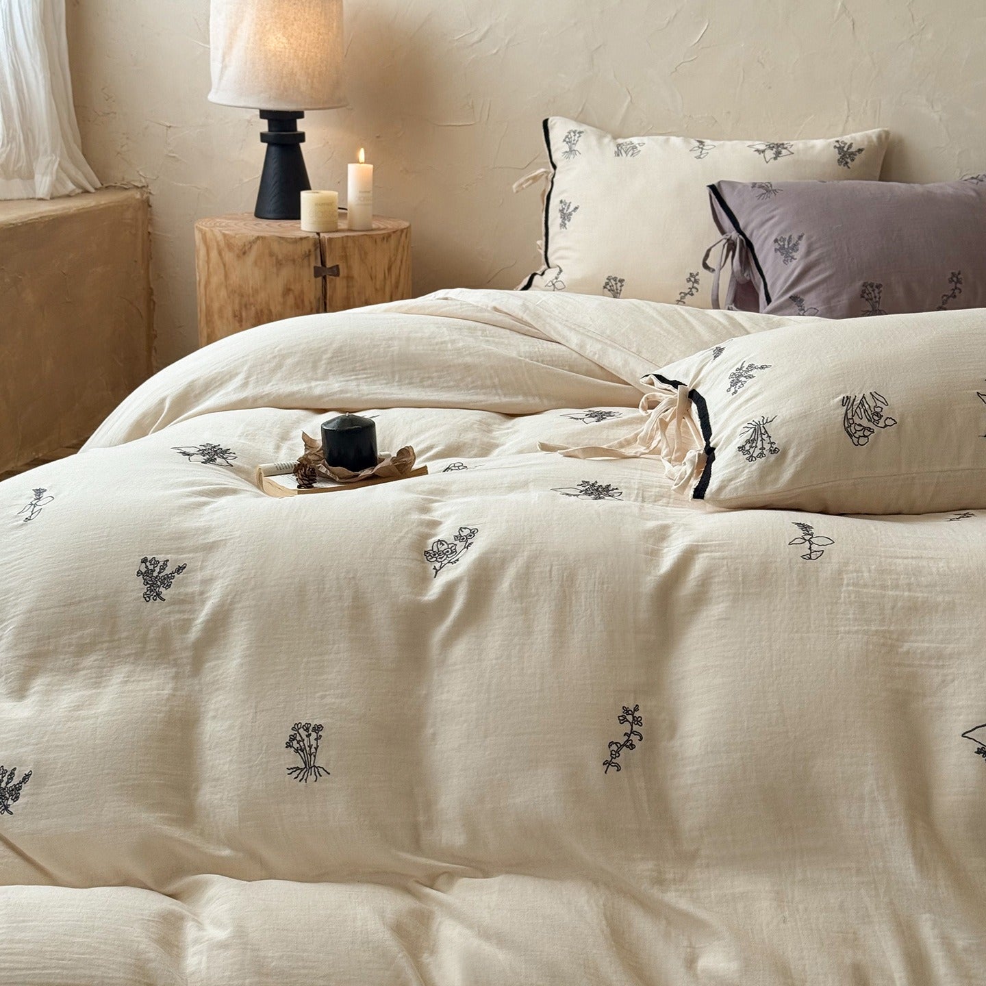 This bedding set blends tranquil botanical charm with understated elegance. It’s adorned with delicate herb and floral embroidery that brings a touch of nature indoors. A standout detail is the tie-closure design on pillowcases; these ties keep pillows snug and add a whimsical, handcrafted flair.