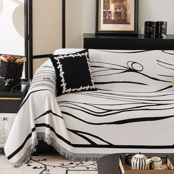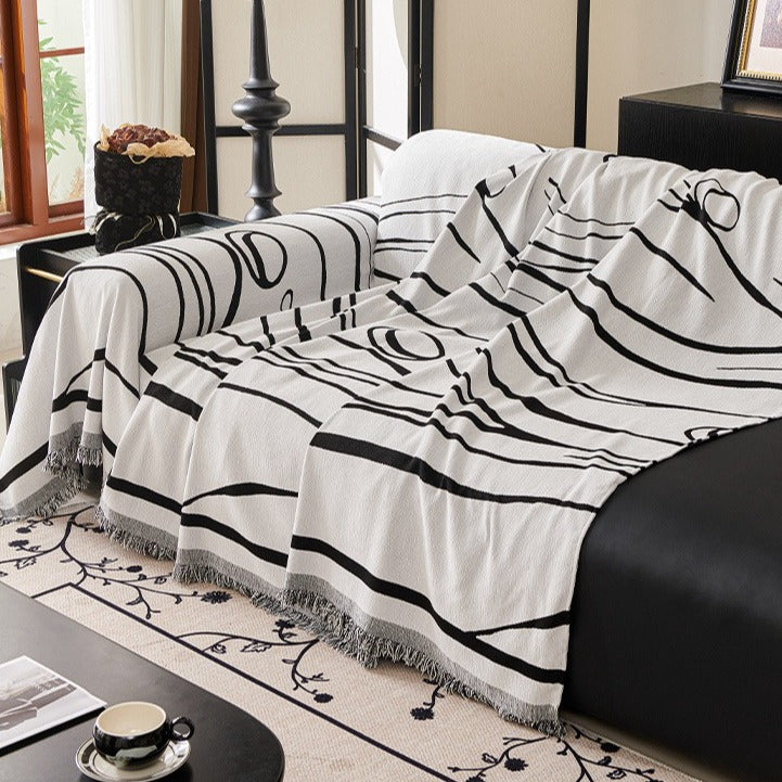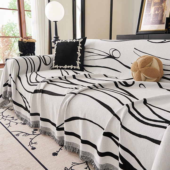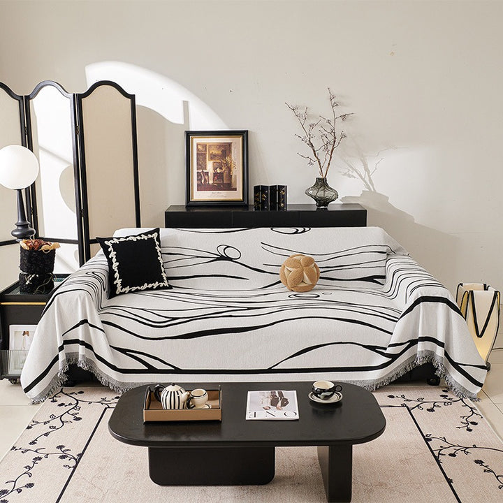 It looks like a giant canvas of flowing black ink draped over your sofa! The wavy, free form lines feel as if they’re dancing across the white fabric, exuding artsy, modern vibes. Fringe edges add a cosy touch, and it shields your couch from scratches or spills, turning your living room into a mini art gallery.