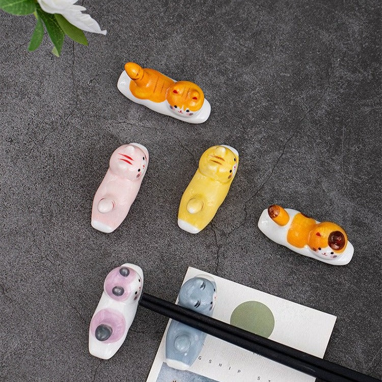 These Sunbathing Cat Chopstick Holders capture the lazy charm of cats enjoying sunlight. Each piece features a kitty in a relaxed, sun-loving pose, with soft and warm details that bring their cosy vibe to life. Crafted from smooth ceramic, they neatly cradle chopsticks to keep your table orderly.