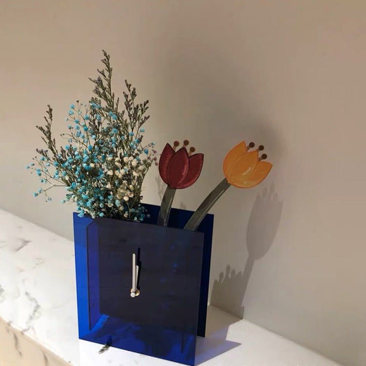 This dynamic clock vase with its striking deep blue shade perfectly combines style and function. The square-shaped vase features a transparent body, crafted from acrylic that complements any decor style. The fully functional clock hand inside adds a unique touch of functionality, making it the perfect centrepiece for any room.